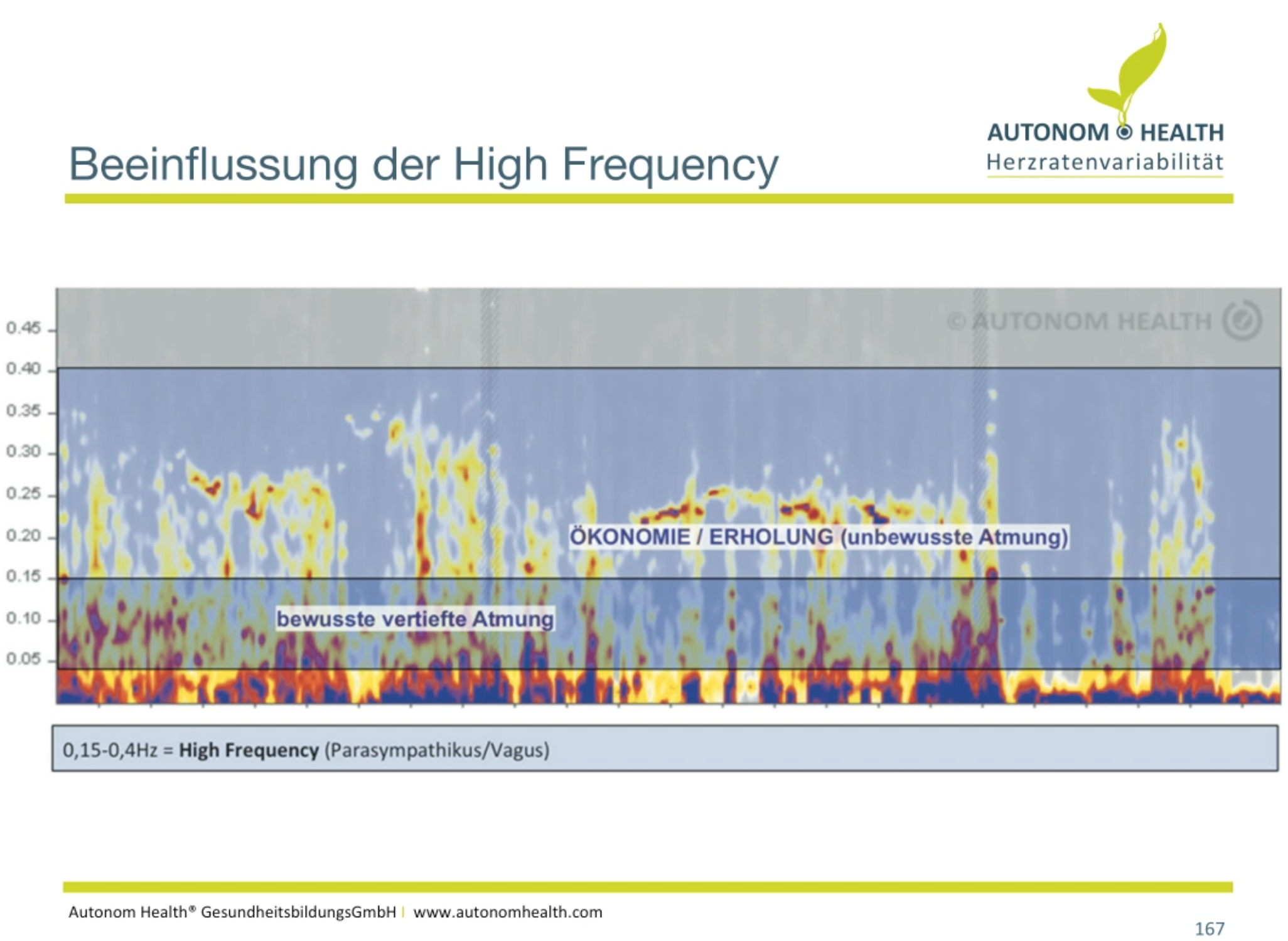 Wenn ich das richtig verstanden habe, dann aktiviere ich beim fokussieren den Sympathikus - dieser zeigt sich bei 0.1 Hz + 0.2 Hz? Wo würde ich den Parasympathikus sehen, wenn ich frei Bauchatmung betreibe? Resp. wie kann ich kontrollieren ob ein effektiver Vagusimpuls stattfindet ?