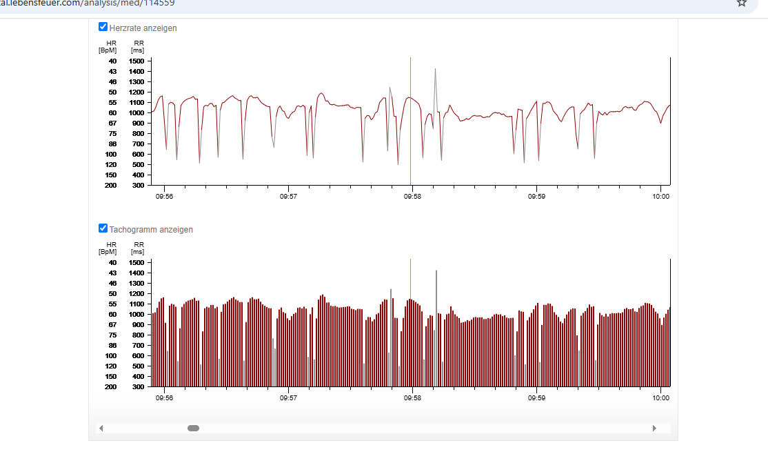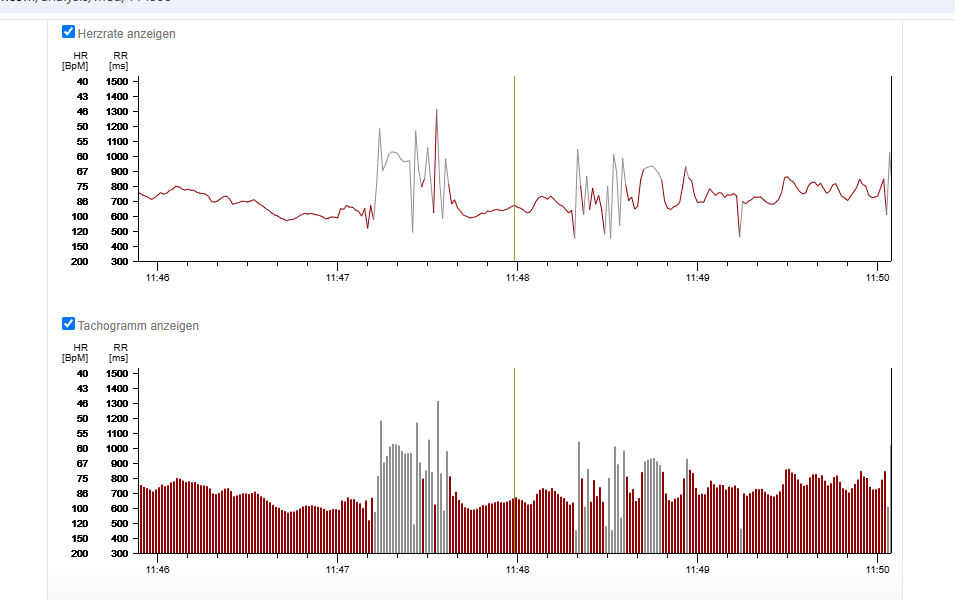 Z.B. von 10.00 bis 10.30 ist die Messung zuerst nicht gefiltert. Trotzdem habe ich beim Tachogramm alle möglichen "Ausschläge" ...