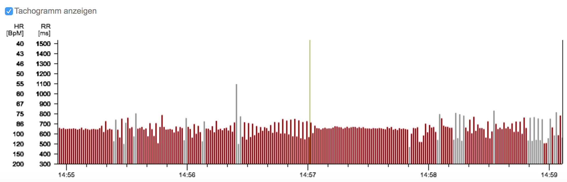 Hat einen sehr starren und schnellen Puls (87 BpM Durchschnitt in 24h). Da stellt sich zum einen die Frage der Wirksamkeit/Dosierung des Betablockers. Daneben gehäufte Extrasystolen (s. Bild). Die Medikamenteneinnahme ist z.Zt. wohl ohne große Effekte, die Frage ob er die Therapie ändern soll muss mit dem behandelnden Arzt geklärt werden. Klicke auf die Grafik für eine vergrößerte Ansicht